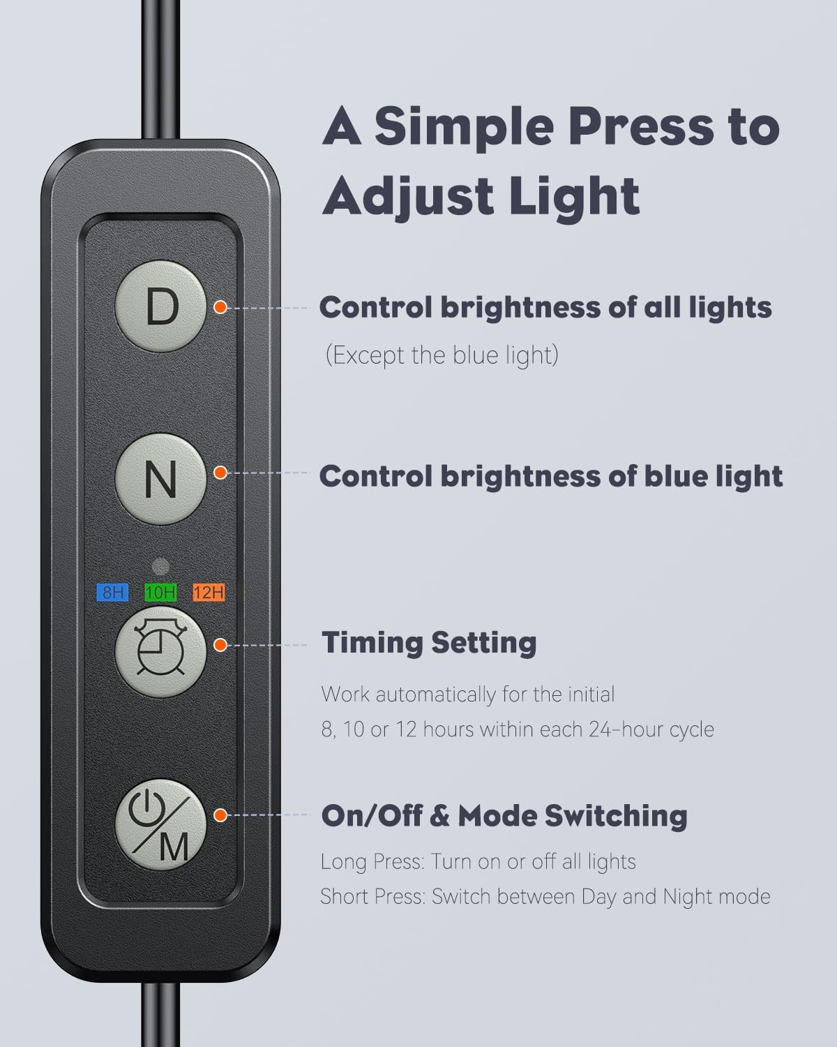 - 2 Lighting Modes: Short press the M button repeatedly on the LED aquarium light to switch between daytime and night modes. Hold the M button for 3 seconds to turn all lights off. Simulate natural sunrise and sunset to enliven fish and help them sleep well